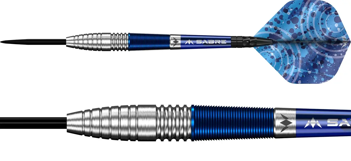 Die blau-silberne Optik kombiniert ein modernes Design mit funktionaler Struktur. Der mittlere Grip bietet zuverlässigen Halt, ohne zu aggressiv zu sein, und eignet sich ideal für Spieler, die Kontrolle statt Übergriffigkeit suchen. Die kopflastige Gewichtsverteilung unterstützt einen stabilen, zielgerichteten Wurf und begünstigt ein sauberes Eindringen ins Board.
