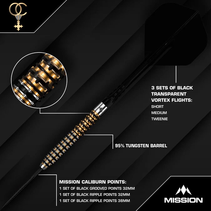 Die Olly Croft Limited Edition Darts bestehen aus hochwertigem 95 % Tungsten und verfügen über verschiedene Fräsungen und Rillen entlang der Barrels. Abgerundet wird das edle Design durch eine stilvolle Gold- und Schwarz-PVD-Beschichtung. Die Darts sind bereits mit dem Mission Caliburn Wechselspitzensystem sowie Mission Force 90 Vortex Flights in Transparent Schwarz ausgestattet.