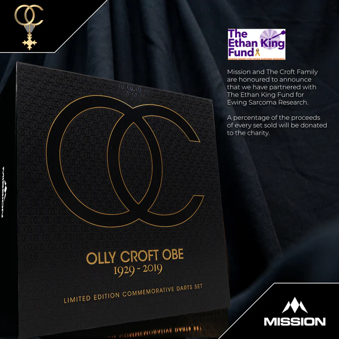 Mission Darts ist stolz darauf, in enger Zusammenarbeit mit der Familie Croft die Mission Olly Croft Limited Edition Darts präsentieren zu dürfen. Von dieser besonderen Gedenkserie wurden weltweit nur 501 einzeln gravierte Sets gefertigt – zur Ehrung des Lebens und Vermächtnisses von Olly Croft OBE (1929–2019).