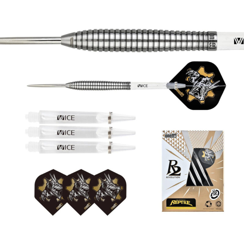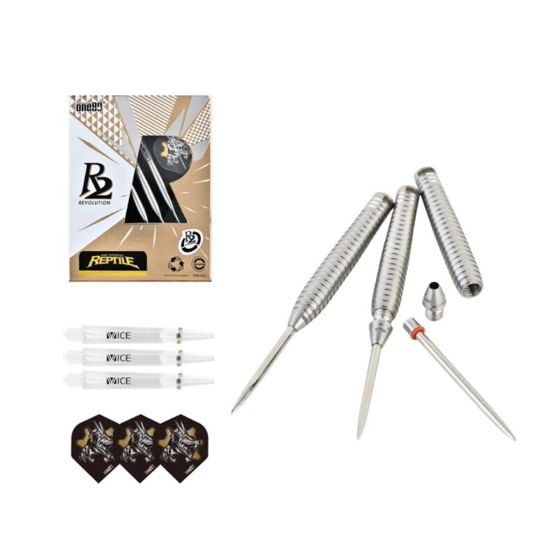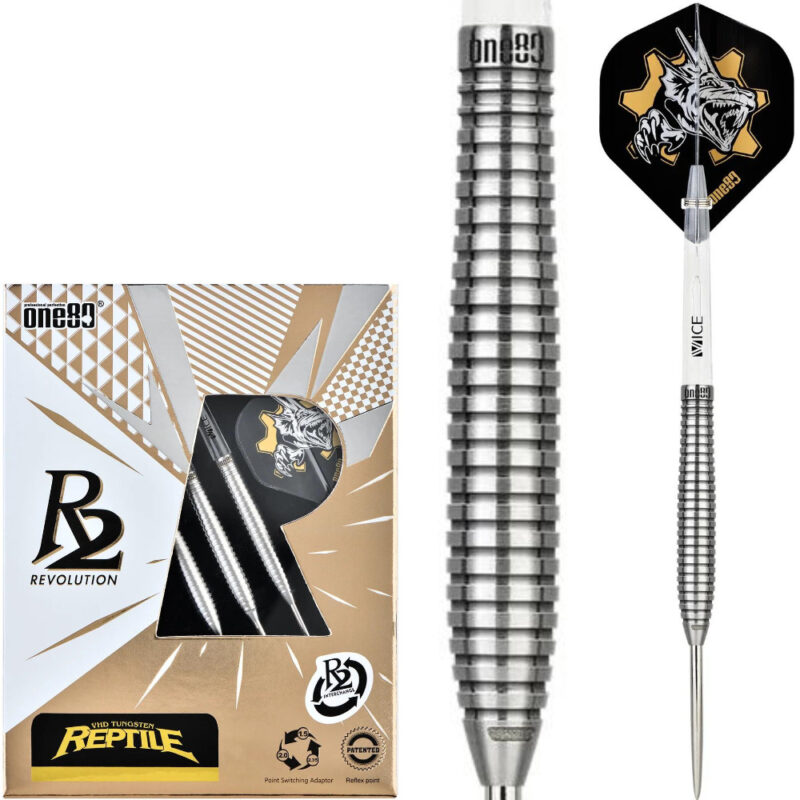 Der neue One80 R2 Interchange Reptile Steeldart. Optisch in silber designed, beinhalten die Darts das einzigartige R2-System. Damit lassen sich Spitzen in Sekundenschnelle austauschen. An einem Dart kann sowohl die 2,35mm, wie auch die 2,0 und 1,5mm dicke Spitze gespielt werden. Ebenfalls lässt sich der Kopf abdrehen, und sich der Dart ganz leicht in einen Softdart mit 2BA-Gewinde umwandeln. Dieses Modell zeichnet sich durch einen kopflastigen Barrel aus. Dieser hat im vorderen wie hinteren Bereich einen durchgezogenen Ringgrip.