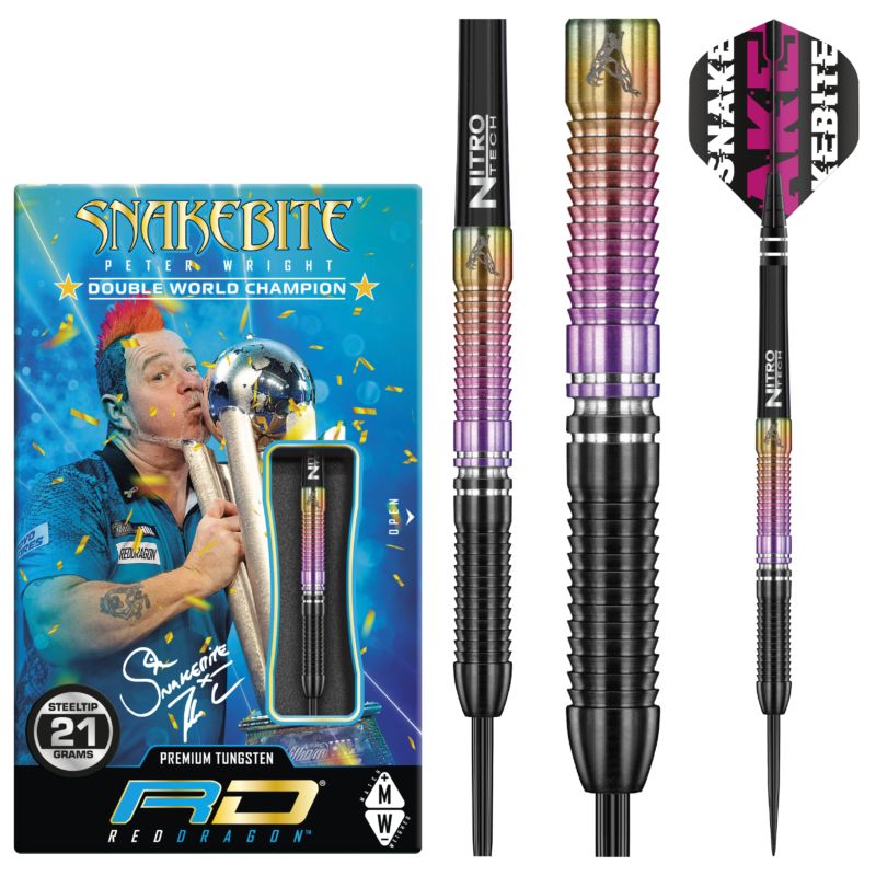 Das Set kommt mit schwarzen Snakebite Nitrotech medium Shafts und Peter Wright Snakebite Flights.