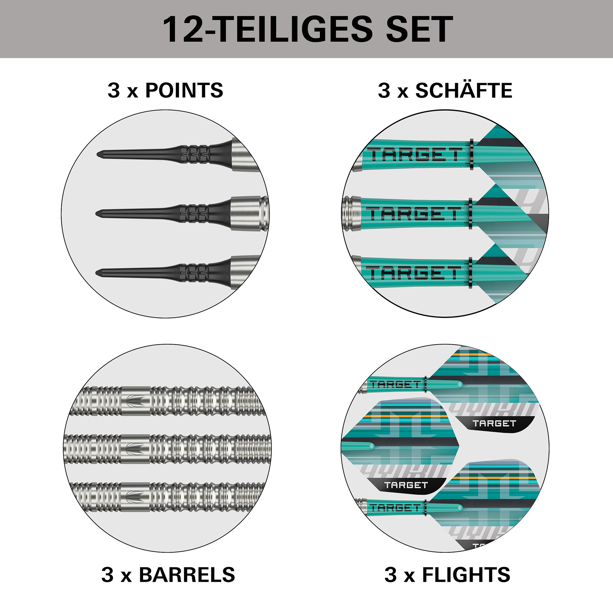 Abgerundet wird das Setup durch robuste Pro Grip TAG Shafts mit optimalem Halt für die Flights sowie den Pro Ultra No.6 Flights im markanten Hydro-Design in Blau und Grün – eine optische Hommage an Wasser, Dynamik und Geschwindigkeit.