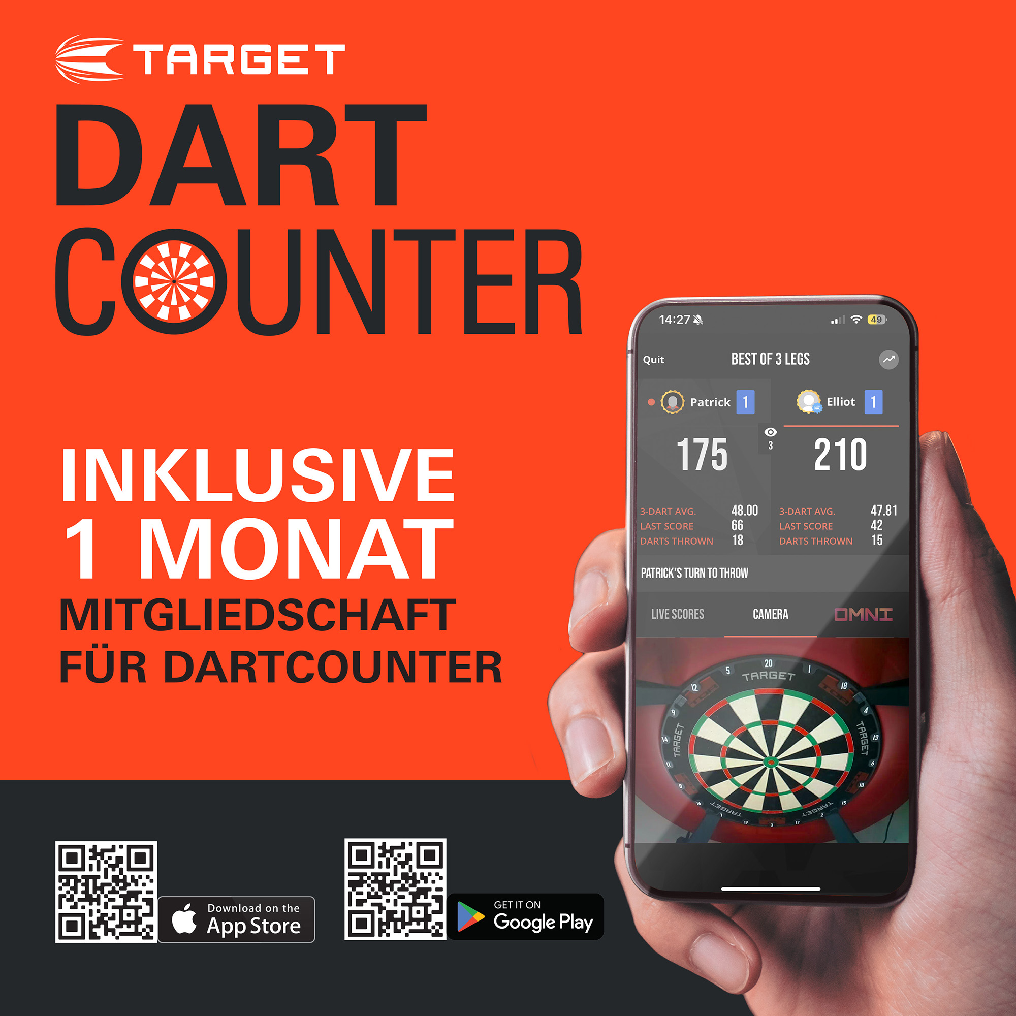Im Lieferumfang enthalten ist zudem ein 1-monatiger Zugang zu DartCounter – der führenden digitalen Plattform für Darts-Scoring. Verfolge deine Statistiken, spiele Online-Matches mit Kameraunterstützung und vernetze dich mit Dartspielern aus der ganzen Welt.