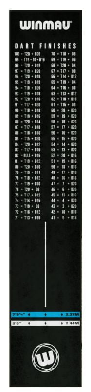 Hochwertige und strapazierfähige Velourmatte, der perfekte Schutz für den Boden. Die Dartmatte ist mit den offiziellen Abstandsmarkierungen für Soft- und Steeldart versehen. Die Unterseite ist mit rutschfestem Gummi überzogen und die Oberseite mit einem sehr angenehm weichen Teppichstoff. Des Weiteren ist eine praktische Checkout-Tabelle abgebildet.